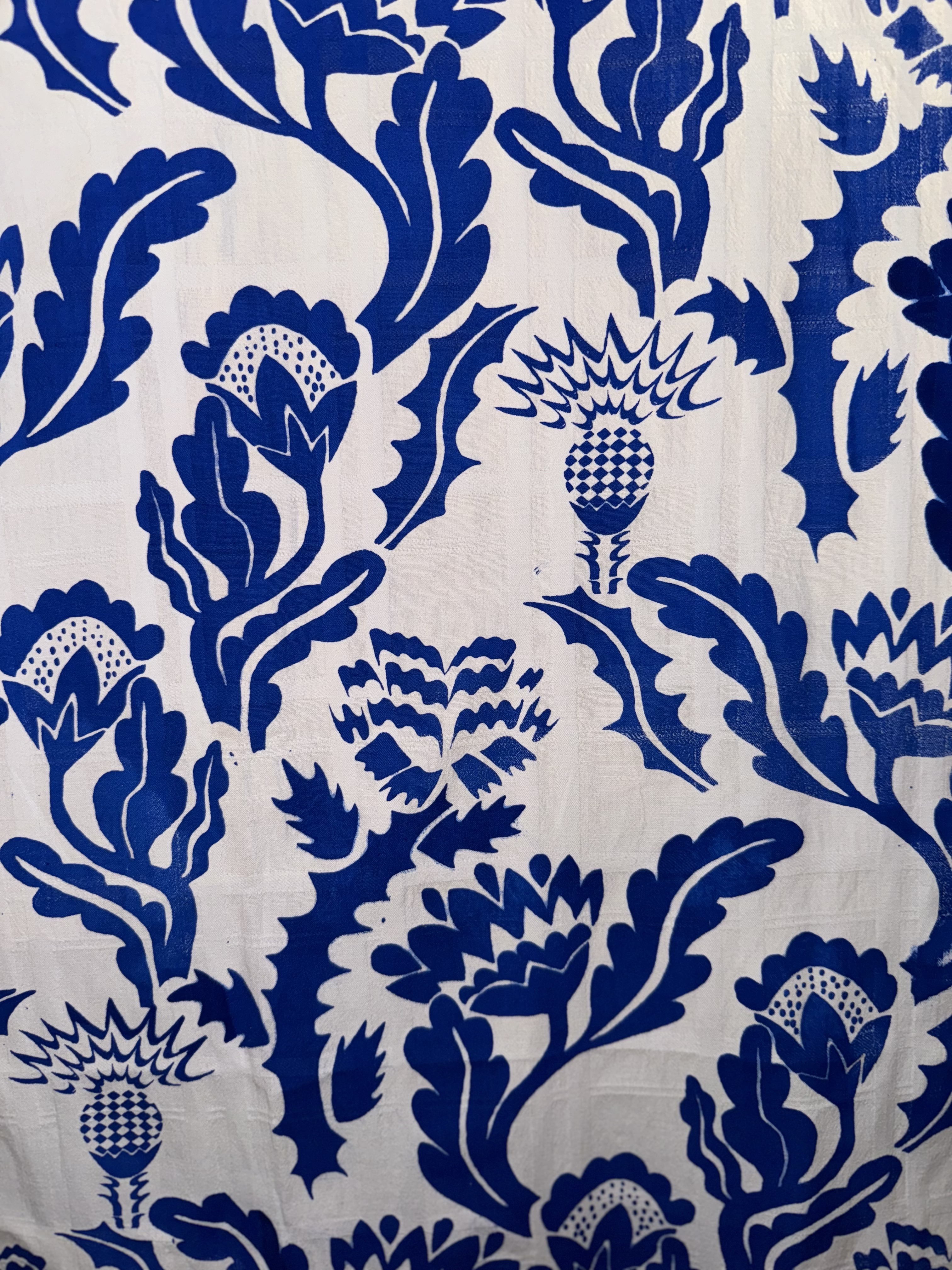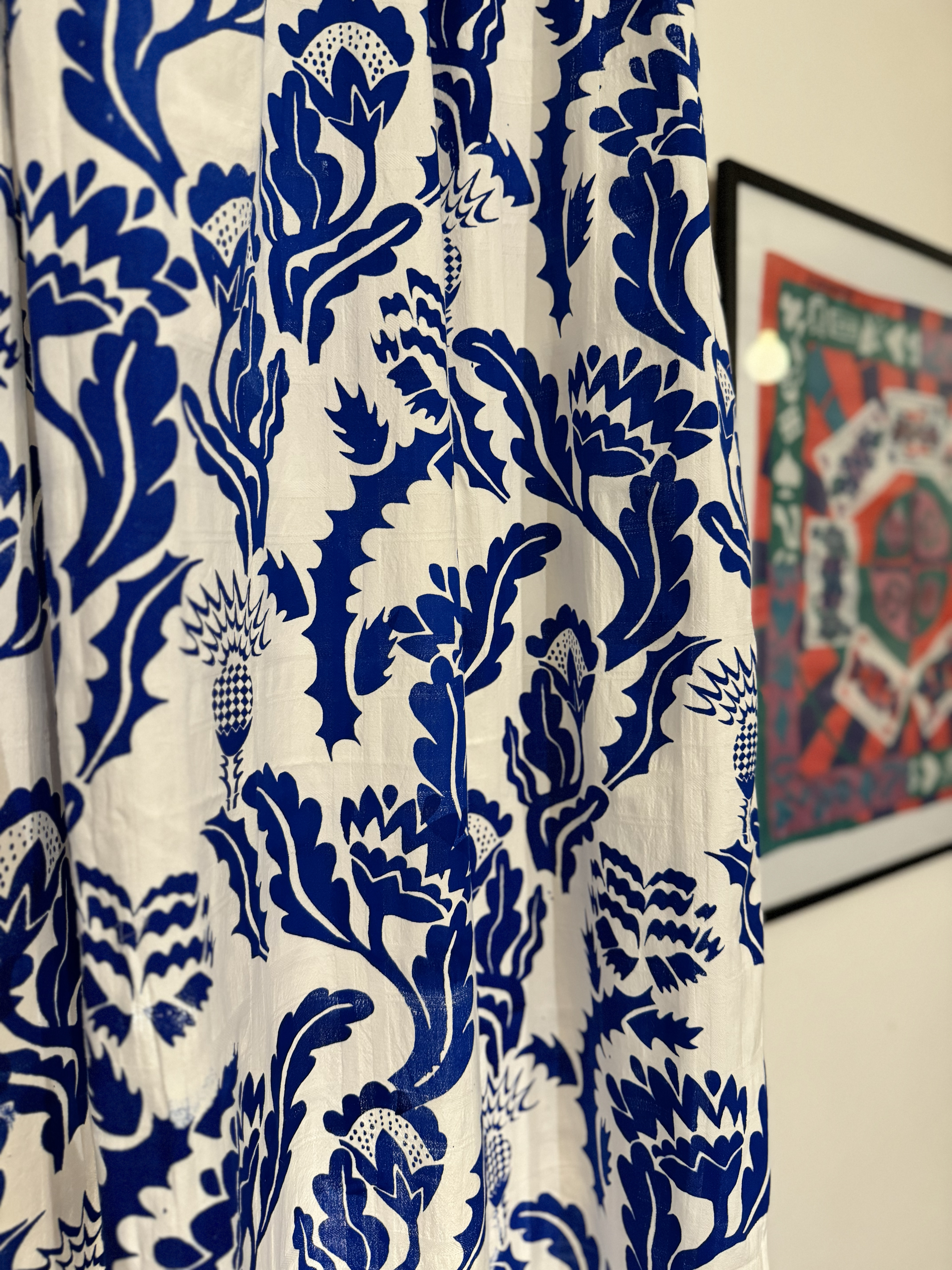 Pattern inspired by british heraldry and medieval ornaments. Screenprinted on thrifted curtain/cotton fabric.